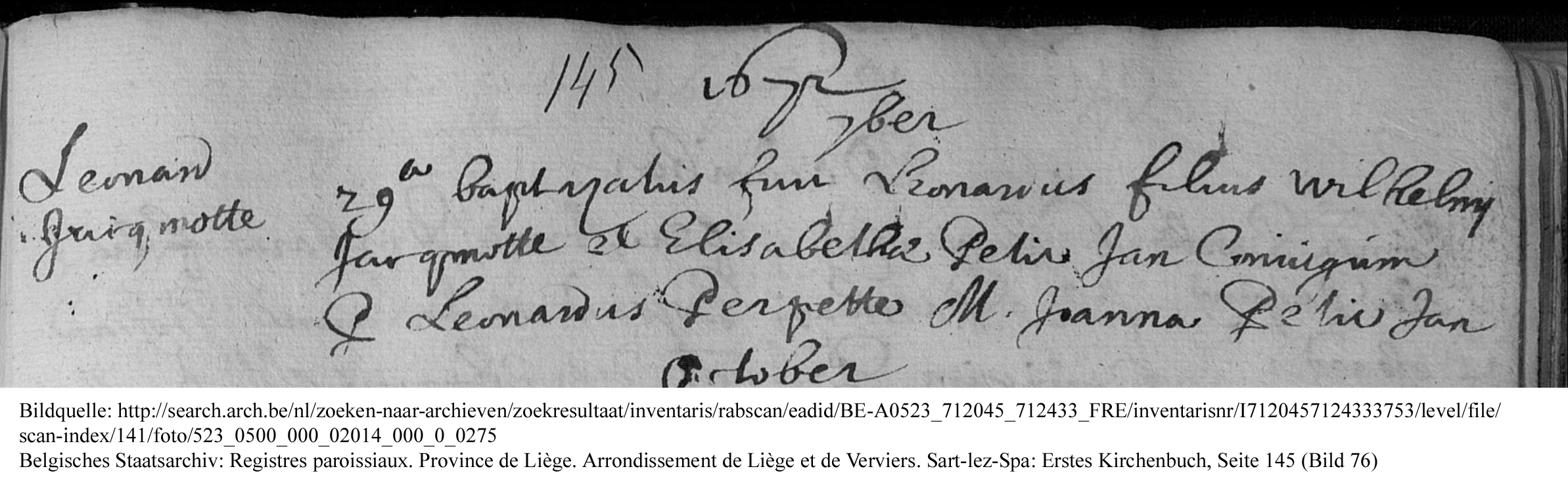 Es galt die Orte im größeren Umkreis und innerhalb des Bistums Lüttich nach folgenden Kriterien abzusuchen: zwei Brüder Jean und Léonard Jacquemot(te), geboren in den 1670er Jahren und wahrscheinlich in der Eisenverhüttung beschäftigt. Die Zentren dieses Gewerbes lagen im späten 17. Jh. in Lüttich und Verviers. Für Lüttich listet das Verzeichnis auf der Webseite des Archivs über 40 Pfarreien auf, die alle im 19. Jh. indexiert wurden. Ebenso existiert ein Gesamtindex für alle Pfarreien. Verviers bestand nur aus der Pfarrei St. Remacle (Taufen ab 1573), die ebenfalls durch einen Index erschlossen ist. Leider brachte die Recherche hier keinen Erfolg. Auf diese Weise hätte man mit den anderen Pfarreien weiter verfahren können, was aber immer noch eine immense Sucharbeit geworden wäre. Ich entschied mich dann über das genealogische Portal Ancestry mit Hilfe der Suchfunktion “Hot Spots” zu erstellen, wo der Name “Jacquemot(te)” im 17. Jh. häufig war. Neben verschiedenen Orten in Belgien ergab sich eine interessante Konzentration des Namens in der Gegend um Reims in Frankreich. Eine der Hinweise führte mich dann nach Lierneux, ein Ort ca. 55 km südlich von Lüttich und ca. 10 km nördlich von Luxemburg. Die Pfarrei St. André verwaltete neben dem Ort Lierneux selbst noch über zehn weitere kleine Weiler, Taufmatrikel sind ab 1671 erhalten. Die beiden Orte Petit-Sart und Grand-Sart bilden eine eigene Pfarrei St. Walburge, einer Tochterpfarrei von St. André (Taufen ebenfalls ab 1671). Der Index für Lierneux weist einen Namen “Jacquemotte” für Ende des 17. Jhs. durchaus in dem Weiler Rèhârmont nach, kennt aber die gesuchten beiden Brüder nicht. Der Durchbruch gelang Anfang November 2016 erst bei Durchsicht des Registers für den Ort Sart. Hier fanden sich unter dem Namen “Jacqmotte” nur vier Taufen: Guillaume get. 11.04.1670, Léonard get. 29.09.1672, Jean get. 23.05.1675 und Élisabeth get. 01.02.1680. Weitere Angaben waren dem Index aus dem 19. Jh. nicht zu entnehmen. Auch gab das Kirchenbuch von Sart bei Lierneux keine Auskunft. Seltsamerweise lag die Anzahl der seit 1671 eingetragenen Taufen bei etwa nur fünf Einträge pro Jahr. Das konnte also nicht das Sart bei Lierneux sein. Ich wußte aber noch von der Recherche in Jalhay, dass es dort einen Ort gleichen Namens gab, und zwar Sart-lez-Spa. Und tatsächlich: die Einträge in den Kirchenbüchern dieses Ortes passten zum Index. Ich habe das Archiv dann sofort benachrichtigt, dass sie den alphabetischen Index unter dem richtigen Ort listen, um nicht noch jemanden in die Irre zu führen. Wie ich im Folgenden noch erläutern werde, kann es mittlerweile als gesichert gelten, dass es sich bei dem am 23.05.1675 in Sart-lez-Spa getauften Jean Jacquemotte um den Stammvater der Nieverner Linie und bei dem am 29.09.1672 in Sart-lez-Spa getauften Léonard Jacquemotte um den Stammvater der Arzbacher Linie handelt.